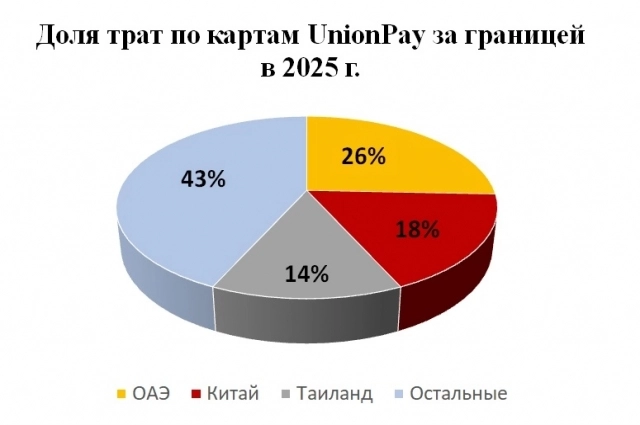 Аналитики Россельхозбанка выделили три страны-лидера по общему объему трат по картам UnionPay за 2025 году за рубежом. Первую строчку занимают Объединенные Арабские Эмираты, что составляет 26% от общего объема трат (43%), на втором месте - Китай (18%) и на третьем - Таиланд (14%). На эти три государства приходится более половины всех зарубежных расходов россиян.