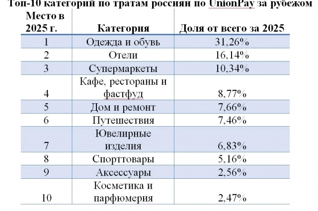 Объемы трат россиян за рубежом за 10 месяцев 2025 года по картам UnionPay выросли на 81,7% к аналогичному периоду прошлого года, выяснил Россельхозбанк. По состоянию на 2025 год число клиентов с тратами по картам UnionPay увеличилось в 2,5 раза. Самыми востребованными категориями стали «Одежда и обувь», «Отели» и «Супермаркеты». При этом существенно возрос интерес россиян к искусству.