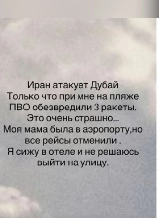 25-летняя модель, уроженка Оренбуржья, в тот момент находилась в Дубае. По её словам, прямо во время прогулки на пляже она стала свидетельницей работы ПВО.