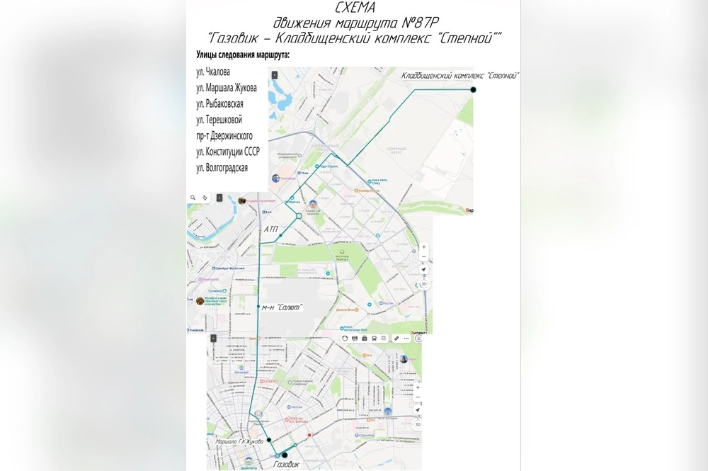 Маршрут №87Р начнет движение от Никольского собора мимо ДК «Газовик», улицы Маршала Жукова, магазина «Салют», АТП и до кладбищенского комплекса «Степной». Обратно автобус поедет через те же остановки.