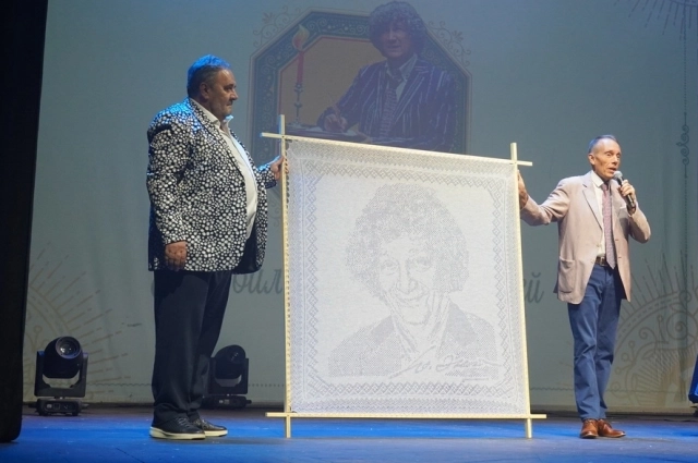 От имени всех оренбуржцев директор хора «Новые имена» Лев Назаров и президент Оренбургского благотворительного фонда «Евразия» Игорь Храмов преподнесли юбиляру ажурный пуховый платок, созданный мастерицами оренбургской фабрики пуховых платков с портретом Юрия Сергеевича.