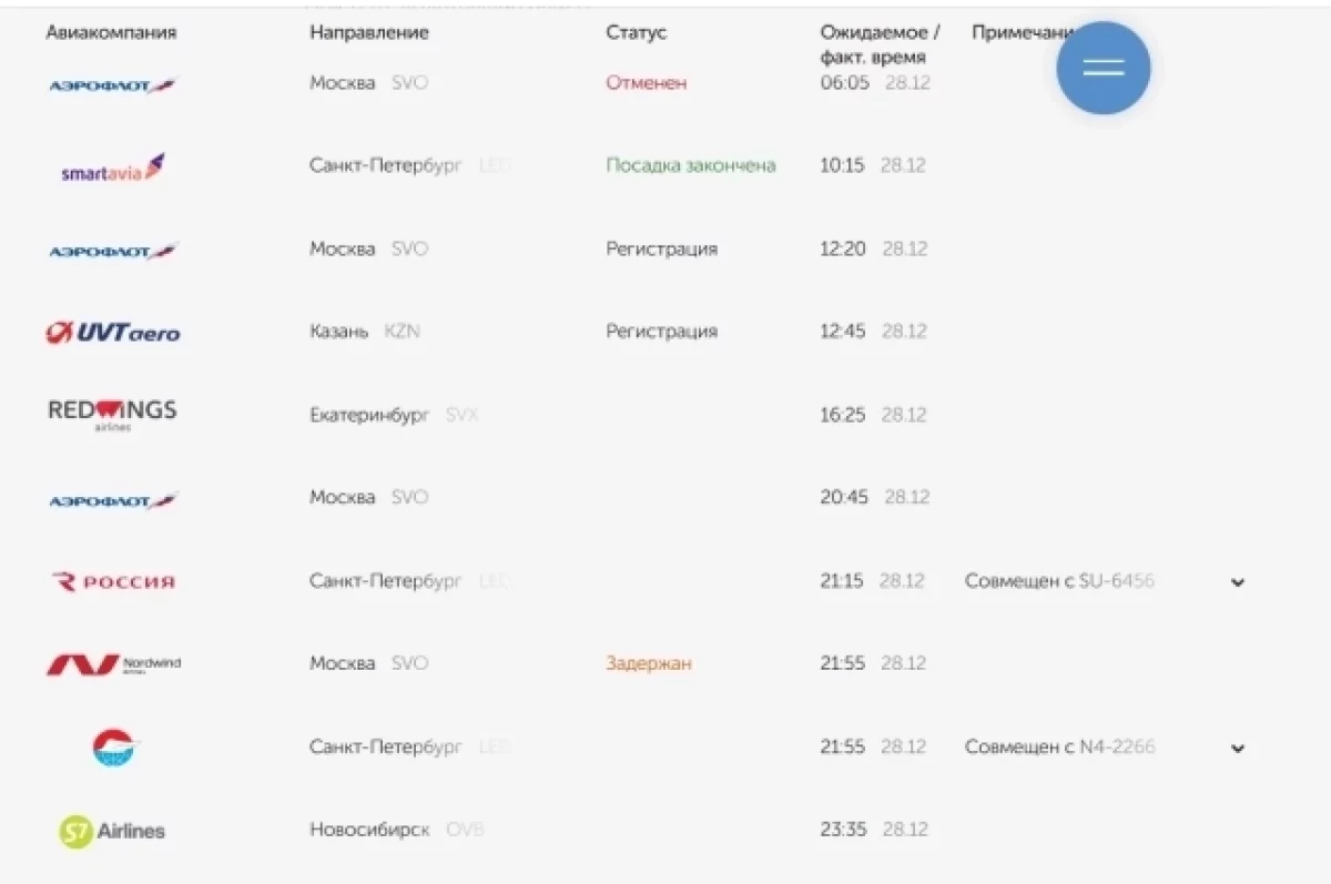 В воскресенье, 28 декабря, отменен один утренний рейс в Москву, второй, стоящий со временем вылета в 19.35, на онлайн табло отмечен, как «задержан».
