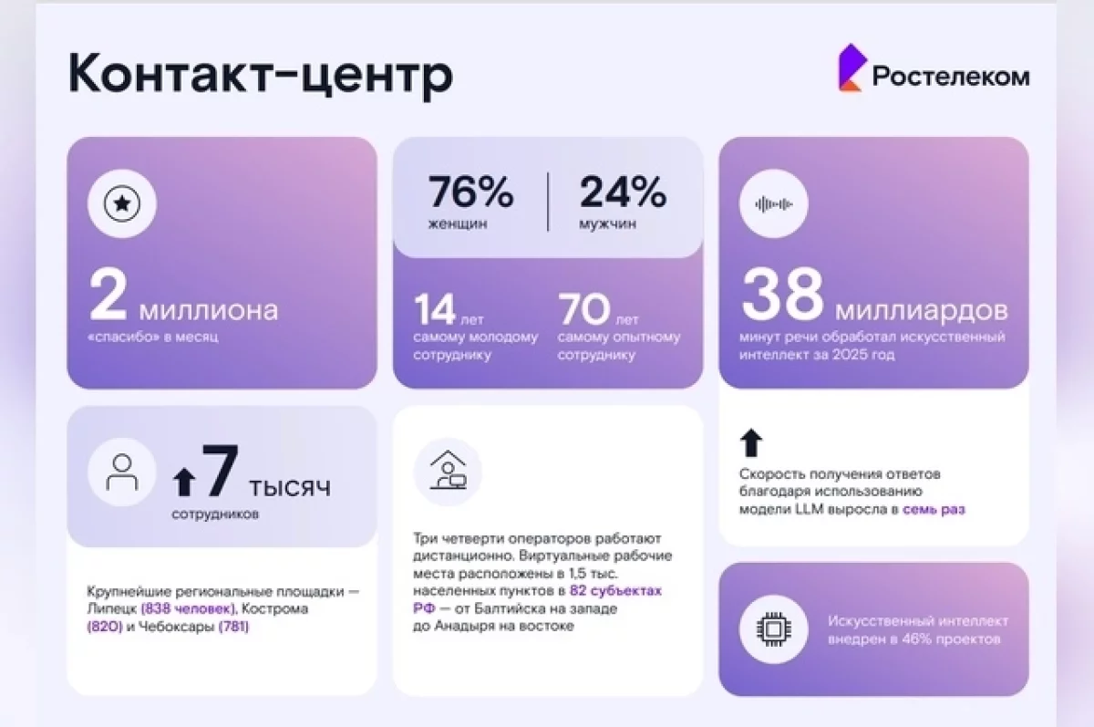 В 2025 году «Ростелеком Контакт-центру» исполняется 30 лет. Сегодня компания входит в топ-3 крупнейших аутсорсинговых контакт-центров России, постоянно внедряет инновационные решения для работы с клиентами, в том числе на базе ИИ и больших данных.