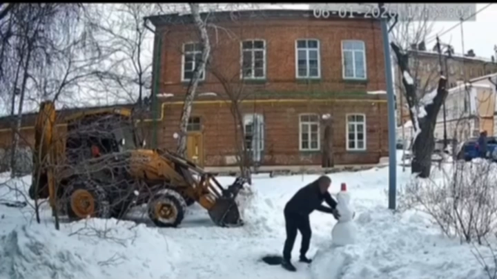 Вместо того чтобы убрать снежную скульптуру ковшом, как предписывает обычная рабочая логика, мужчина остановил машину, вышел из кабины и бережно, двумя руками, перенёс снеговика в безопасное место — подальше от техники и расчищенной дороги. Только убедившись, что детскому творению ничего не угрожает, он вернулся к исполнению своих обязанностей.