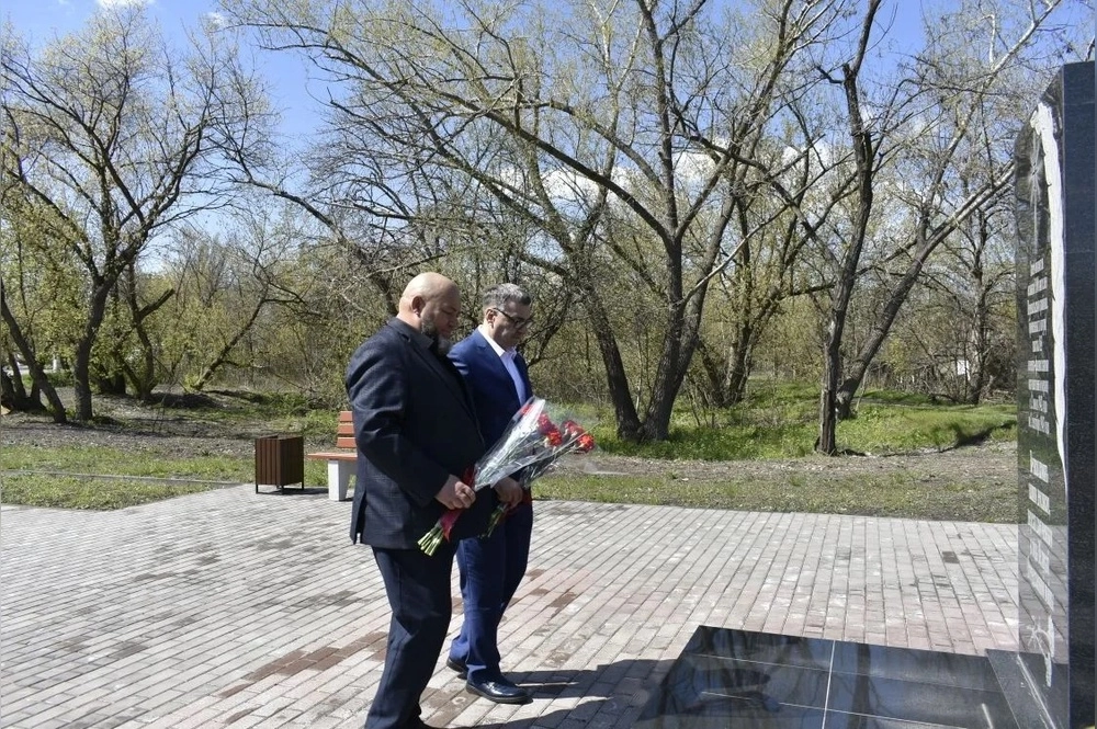 Затем вместе с Андреем Сычёвым Сергей Бабин возложил цветы к памятнику погибшим в Великой Отечественной войне. Это место с тяжёлой и страшной историей: в шурфе шахты №3 покоятся больше тысячи останков местных жителей, сброшенных туда фашистами в годы оккупации. Оренбургские специалисты восстановили монумент в прошлом году, и тогда же при поддержке Оренбуржья вокруг разбили парк.