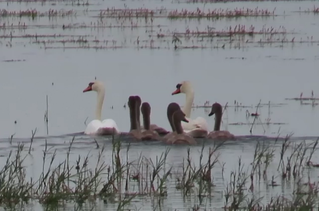 В оренбургском заказнике "Светлинский" на озерах засняли семью лебедей: родители и шесть птенцов.