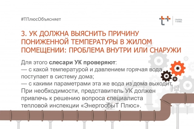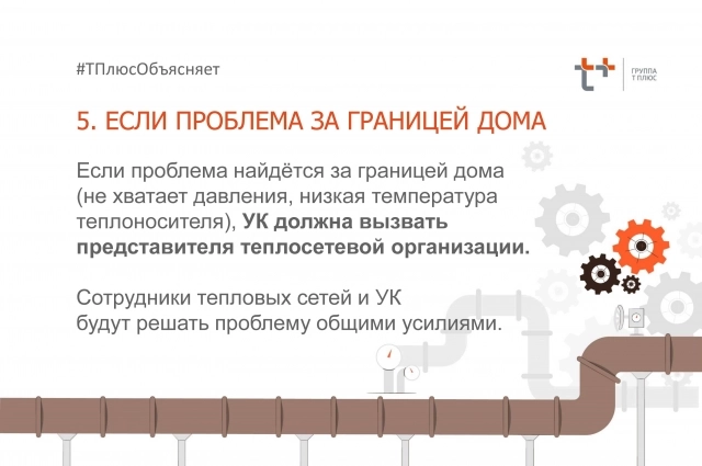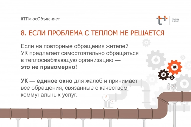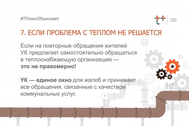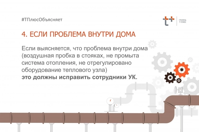 Энергетики «Т Плюс» напоминают: если управляющая компания в ответ на обращения жильцов предлагает им самим обращаться в теплоснабжающую организацию — это неправомерно. В случаях, когда для устранения проблем с отоплением необходимо участие специалистов теплосетей или тепловой инспекции, их должна пригласить жилищная организация.